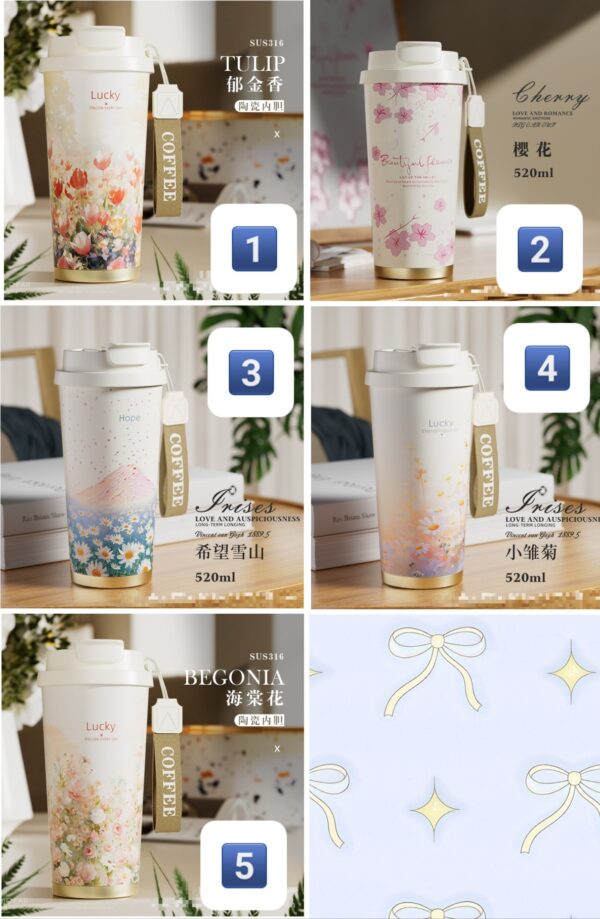 💕316不鏽鋼材質,內膽是陶瓷內膽覆蓋 耐高溫100度 不僅比普通的304保溫保冷效果好 也更容易清洗 不沾杯 🍵自帶小茶倉 喜歡喝花茶果茶的泡起來就很方便 520毫升大容量 無論是上班途中,還是戶外旅行,亦或是辦公 都是不錯的選擇 ➡款式 :🅰️鬱金香 / 🅱️櫻花 / 🅾️希望雪山 ➡規格520ml