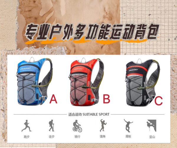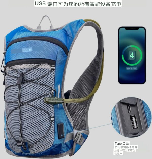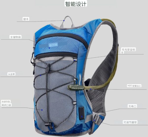🔆書包僅300 克, 輕若無物 🤖智能揹包:內置 USB 充電隨時續航,Type-C 接口,可將移動電源直接連接到揹包上進行充電。手機📱在外也能持續續航 💦書包內有專用水袋隔層,並贈送一個價值$18的 2 升容量水袋, 採用帶開關的吸管閥門,帶有快速連接附件可以邊走邊騎邊喝, 非常方便 🎒 高密度尼龍面料,耐磨防水, 無懼風雨, 保護包內物品安全 🎒 背部透氣網格布,運動時無悶熱感,時刻保持舒爽 🚴♀️緊貼背部,滿足人體工程學的設計機構,科學承重,不增加脊椎負擔 ✨ 包包多處夜間反光條設計,夜間出行跑步更安全。 🏃♂️胸前固定卡扣,方便固定揹包,貼合背部 📱揹帶上還有可裝手機, 鑰匙🔑雜物的小口袋