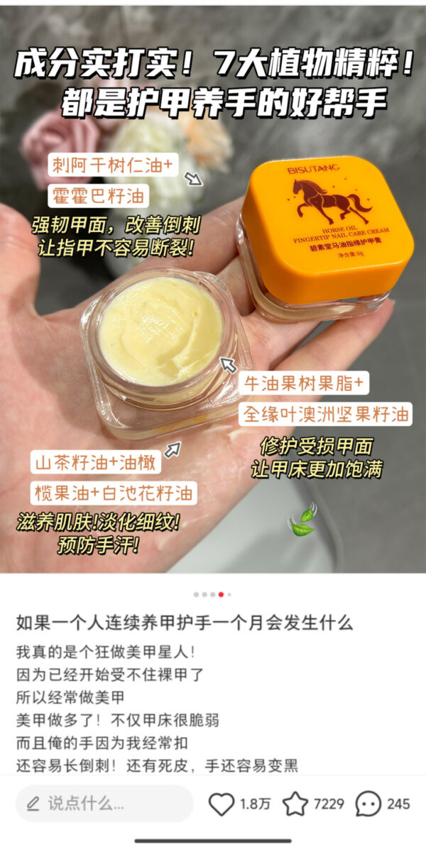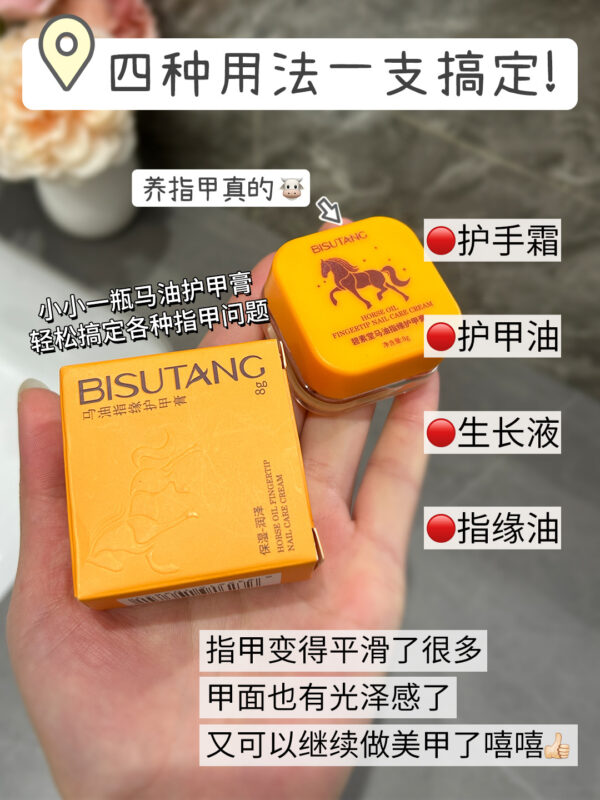 👑😘【碧素堂馬油🐴指緣護甲膏】冷門好物分享!!🎁🎁🎁 ✅小小一瓶護甲膏=護甲油+生甲水+指緣油+護手霜!🐂🍺養出好指甲! ✅滋潤度💦、修護力拉滿、溫和配方,潤手護甲預防倒刺! ✅絲絨膏體質地,絲滑細膩,一抹化水,適合秋冬天用的超絕神仙單品!直接拿下 ,精緻包裝,隨身攜帶!🉑以🈶,可算讓我挖到寶了!姐妹們~~ 它是那種天鵝絨的質地!很綿軟,塗在甲面甲周能很快滲透進去,像給直接直接開了一層保護膜 每次用完都感覺直接亮亮的很潤 就像個“隱形手套”一樣 而且這個不僅僅是個護甲膏 美甲前還能當護手霜用 一瓶四用👉🏻護甲油+生長水+指緣油+護手霜齊活了 護手養甲一整個給安排了! 太適合懶人了! 規格:8g/盒