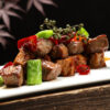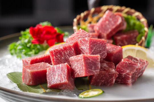 選用安格斯谷飼牛前肩部位,切粒原切、紋理分明