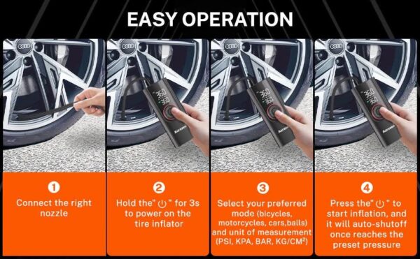 ✅ 5合1智能模式+雙屏顯,小白也能變專家 【汽車/摩托車/自行車/球類/自定義】五大預設,選模式→設數值→一鍵啟動!雙LCD屏實時顯示當前&目標壓力,±1PSI高精度芯片,充到自動停,杜絕過充風險!