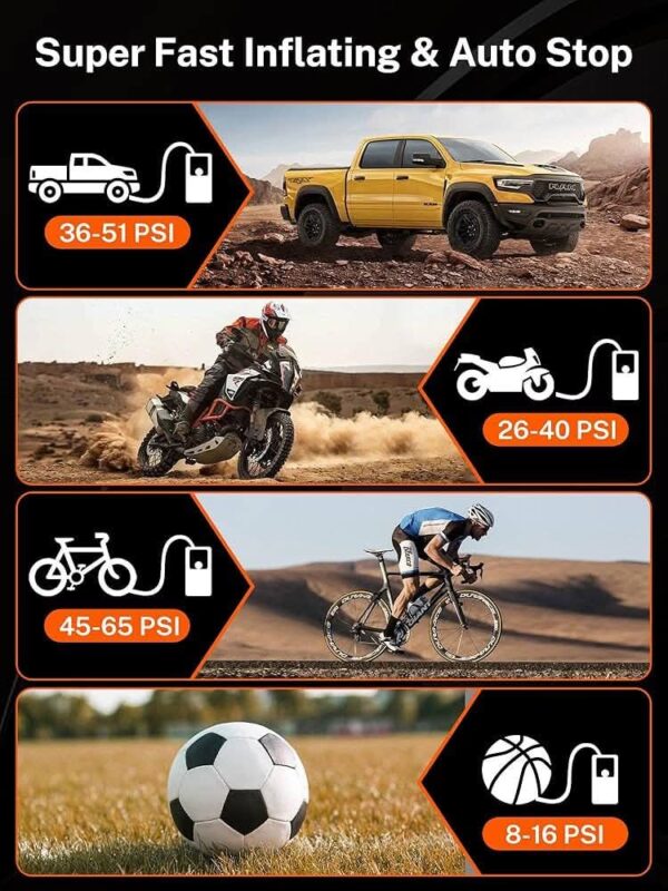 ✅ 快如閃電⚡️150PSI強壓動力 普通充氣泵慢如蝸牛?它3倍速充飽轎車輪胎!強韌銅芯電機,從自行車到SUV輪胎皆可輕鬆應對,胎壓精準穩定,行車安全指數飆升⬆️