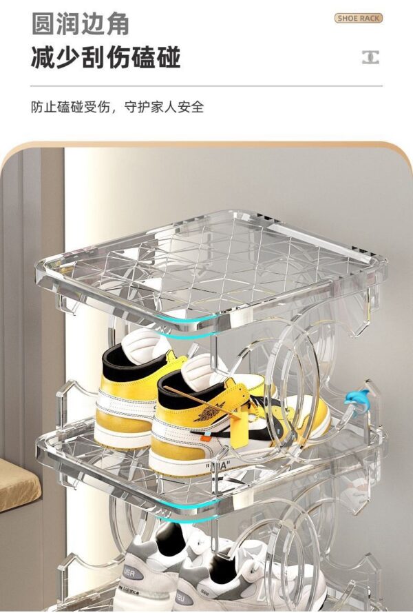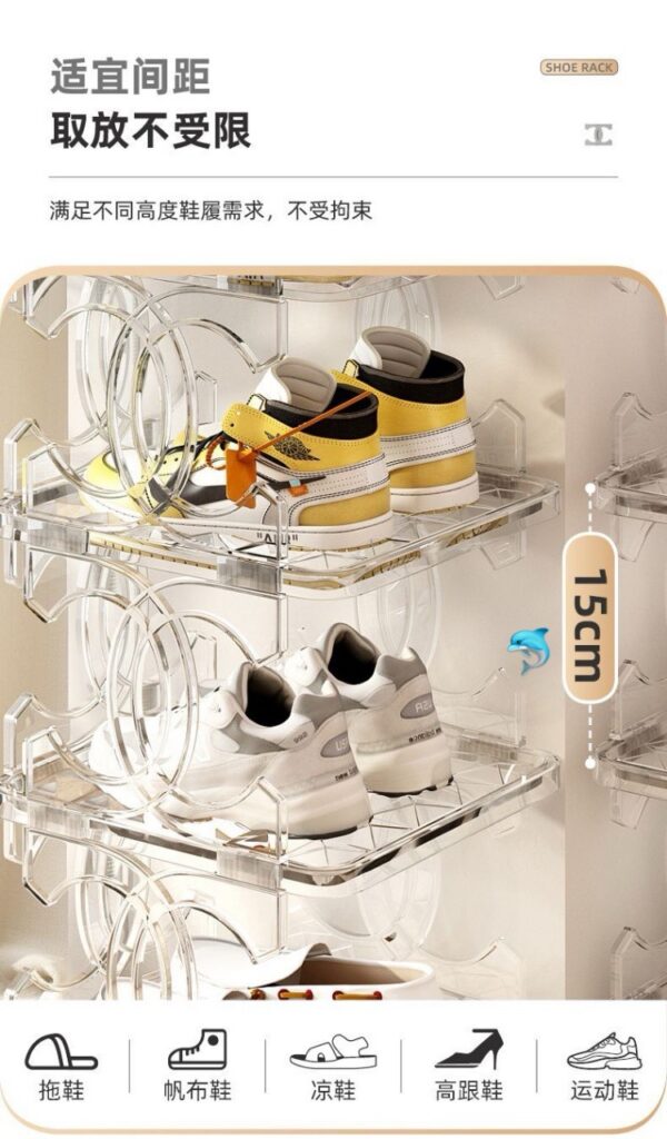 透明鞋架的每一層都足夠透明,讓你一眼就能找到你想要的鞋子。同時,每一層的高度都可以調節,適應不同高度的鞋子。無論你是需要放置高跟鞋👠,平底鞋🥿還是運動鞋👟,這款鞋架都能滿足你的需求。