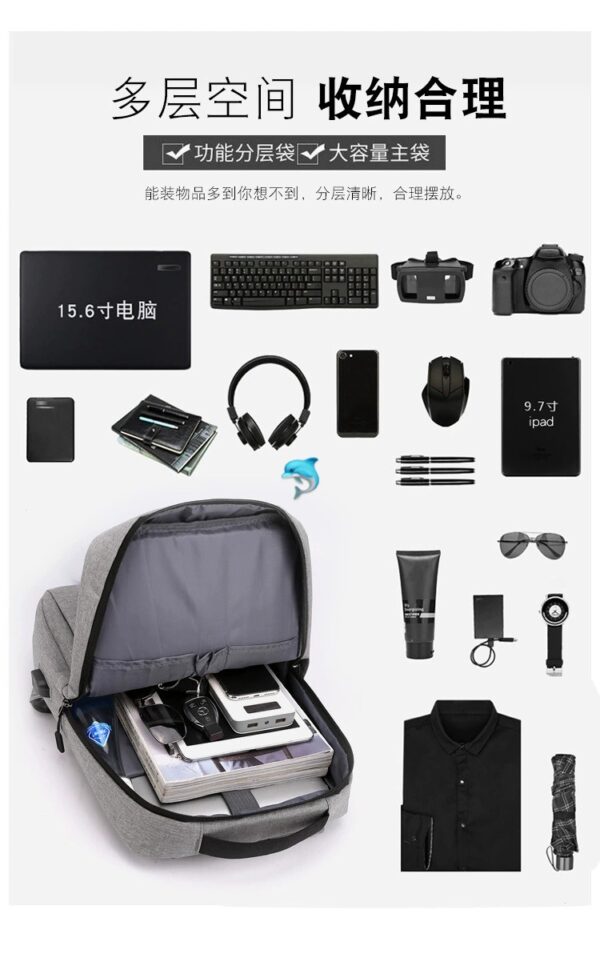 2.空間大:能裝的物品非常多,例如:相機、鏡頭、電腦、充電寶、穩定器各種各樣的電子產品,以及一些日常生活用品,它有大儲倉、獨立電腦倉,小口袋倉,多層分隔,方便分類拿取,外置手機USB充電口設置,出門不用怕手機沒電,隨時隨地想充就充。