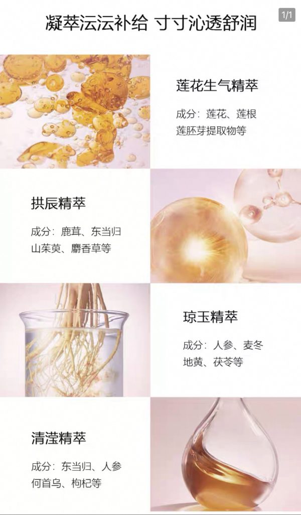 🌿核心精萃 古方今繹 ✔️蓮花生氣精萃——舒緩透亮 ✔️拱辰精萃(鹿茸/當歸)——滋養緊緻 ✔️瓊玉精萃(人參/地黃)——抗老回春 ✔️清湛精萃(枸杞/何首烏)——平衡修護