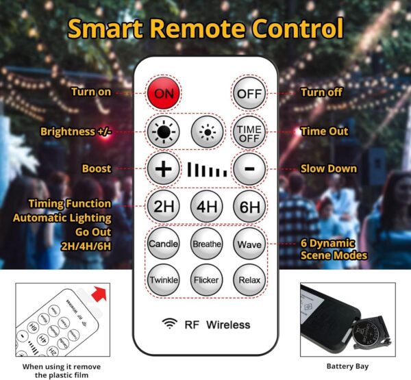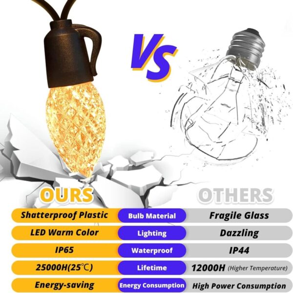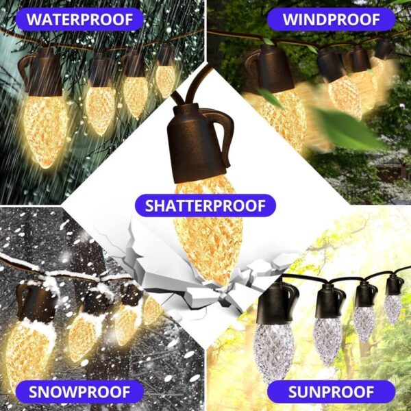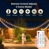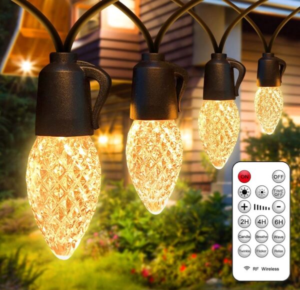 【50尺戶外LED燈帶遙控款】 🌟採用工業級防風雨技術和防碎塑料製成‼️防水等級高達IP65⚠️可以在任何天氣下使用,包括雨天、颳風天、下雪天、晴天🌞 🌟配備了20個C35 1W鑽石形塑膠燈泡,每個燈泡的長度為2.95英寸,相鄰燈泡之間的間隔為22.5英寸,燈泡色溫為2700K-3200K,節能環保♻️ 🉑通過遙控來調光,以及調節6種不同的氛圍模式⚠️易於安裝,每個燈頭上都有一個掛鉤,可以輕鬆地懸掛起來,無需額外購買任何支架和掛鉤