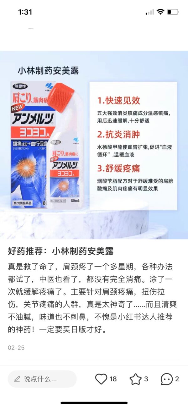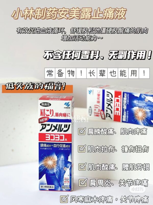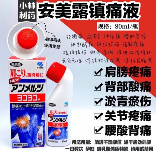 🎉倉庫現貨,人氣補貨到❤️,2029 最新日期,超大大容量80ml 🤔️🇯🇵小林製藥安美露 全身痠痛,塗一下,按摩幾下, 再貼上久光貼,效果加倍好👍 日本藥店銷量第一的肩周炎和肌肉疼藥水。 對付背腰腿頸椎肩周疼痛/跌打損傷/針對肩頸,腰腿,關節疼痛等,治療頸椎病,肩周炎、腰肌勞損、肌肉痠痛的外用特效