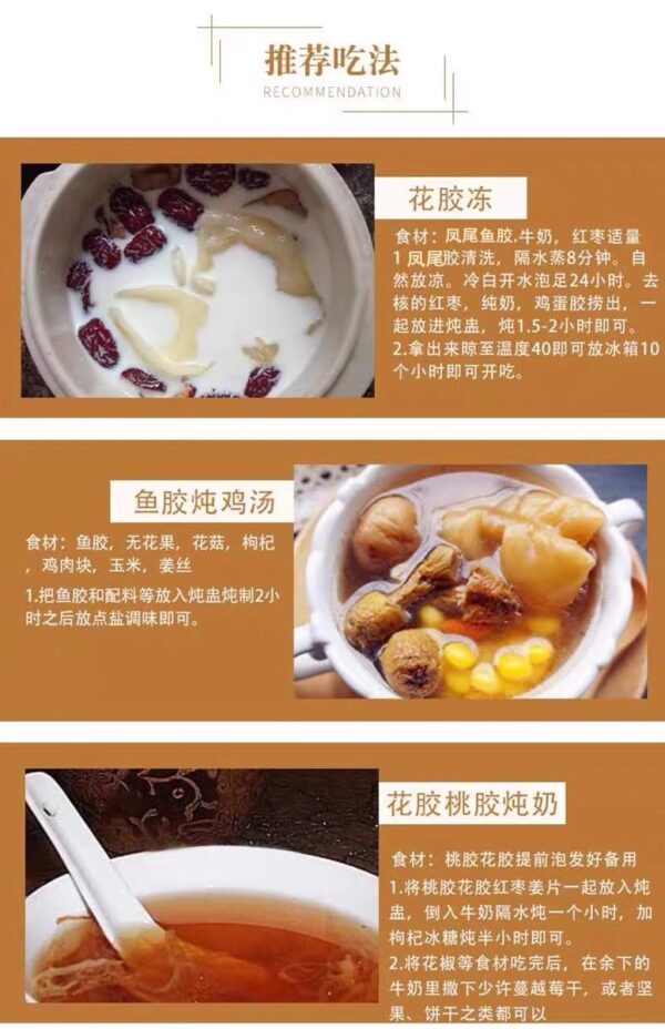 👍👍魚膠即魚鰾(輔助呼吸器官)的乾製品,富膠質,故名魚膠,也稱魚肚、花膠。魚膠與燕窩、魚翅齊名,是“八珍”之一,素有“海洋人蔘”之譽。它的主要成分為高級膠原蛋白、多種維生素及鈣、鋅、鐵、硒等多種微量元素。其蛋白質含量高達84.2%,脂肪僅為0.2%,是理想的高蛋白低脂肪食品。是人體補充、合成蛋白質的原料,且易於吸收和利用。美容養顏,產後恢復,女性必備!
