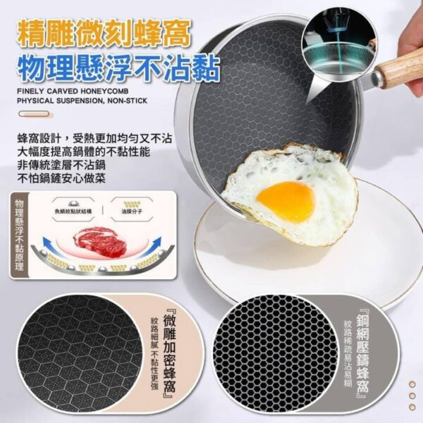 鍋身採用食品級304不鏽鋼,耐腐蝕不易生鏽,經安全檢測👌內壁噴塗優質不沾塗層,耐高溫不易脫落,炒菜少油更健康;實木手柄精選天然櫸木,手工打磨光滑無毛刺,質感溫潤;手柄與鍋身加固鉚釘連接,結實耐用不易鬆動;鍋底沖壓加厚工藝,導熱鍋快速,避免局部燒焦;
