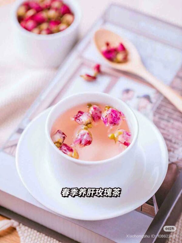 玫瑰花含豐富的維生素A、C、B、E、K以及單寧酸,能改善內分泌失調,可調理血氣、促進血液循環,調理女性生理問題。