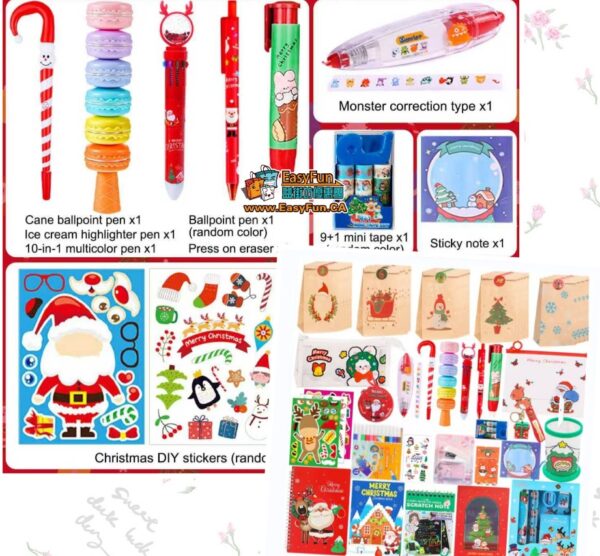 聖誕圓珠筆 / 多色筆 / 熒光筆 聖誕橡皮擦 / 修正帶 / 便利貼 塗色本 / 刮畫本 / 小貼紙 / 紋身貼 迷你膠帶 / 尺子 / 鑰匙扣 / 小收納袋 訂書機 & 多款隨機可愛小驚喜 聖誕禮品袋