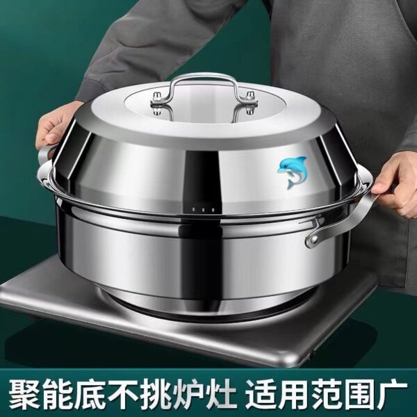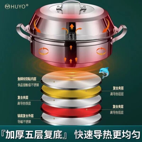 201鋼複合鋼,五層復底(魚鱗紋防粘內層+高導熱鋁層+鐵層等),導熱快還均勻,食材受熱更均勻,煮熟得更快哦~大容量能裝又好用,廚房小白也能輕鬆駕馭~