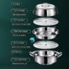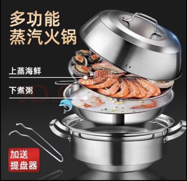 材質:201鋼複合鋼 鍋直徑:36cm 鍋灶:適用各種鍋灶 規格:菜盤蒸片隔層+大小蒸片 尺寸:外徑35.8cm、內徑33cm,鍋總高25.5cm