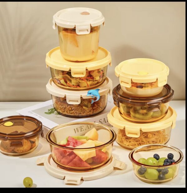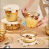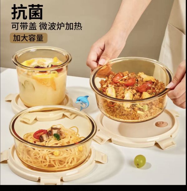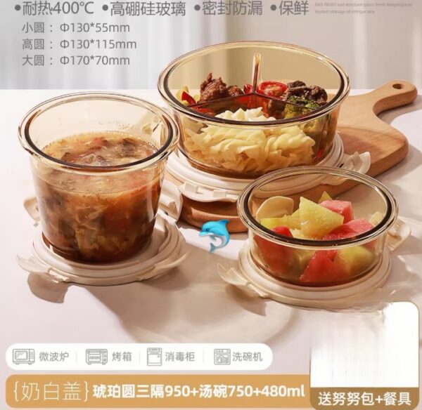 琥珀色玻璃圓三格三件套飯盒