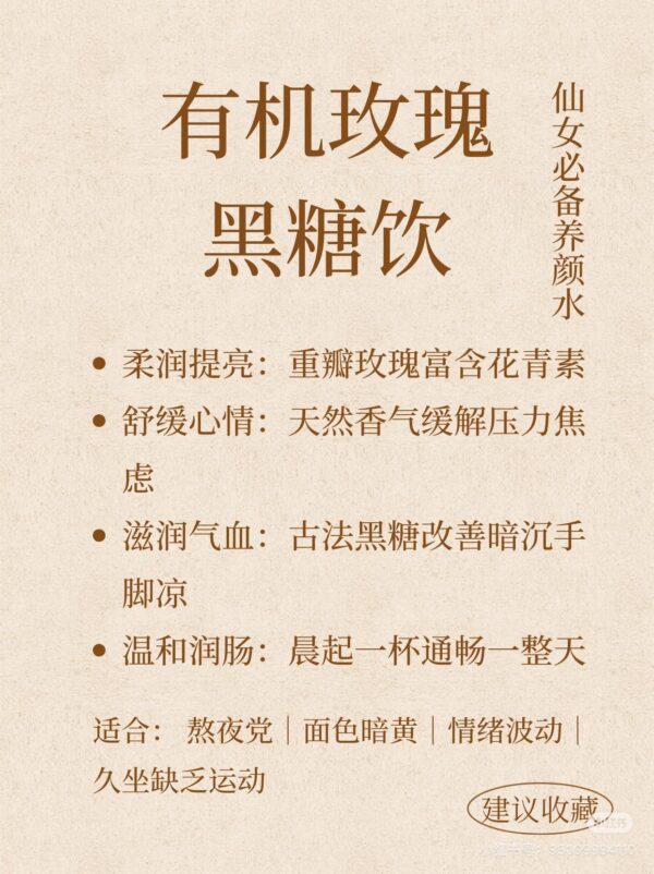 🌹 有機玫瑰黑糖 · 喝出透亮好氣色 ▫️ 重瓣玫瑰富含花青素,柔潤提亮 ▫️ 舒緩焦慮,自帶天然香氣療愈力 ▫️ 改善暗沉手腳涼,晨起一杯潤腸輕盈 👉 適合:熬夜黨、面色暗黃、久坐少動的你