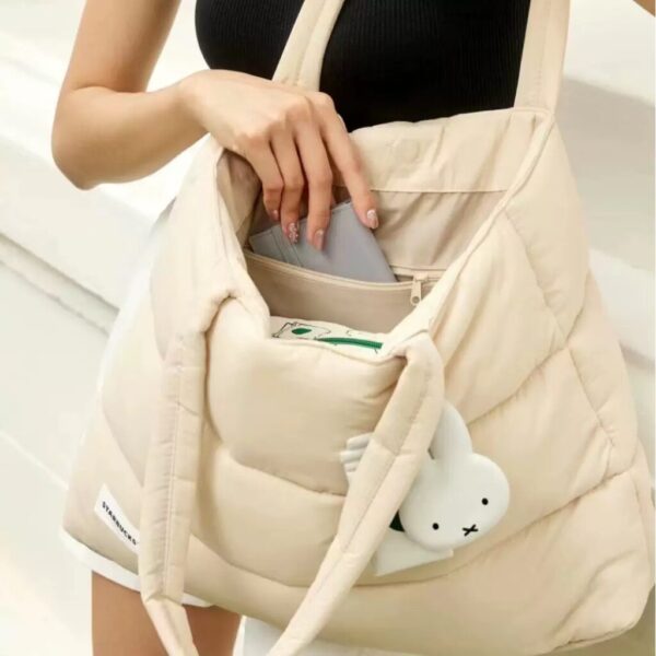 🐱新品預訂,下單後約4-8週到貨‼️ 🎉米菲兔-星巴克聯名羽絨托特包 🐰軟fufu雲朵感托特包,把可愛焊在包上! 立體米菲掛飾+絎縫棉質感,背出門回頭率超高✨ 🏙️ 適配多種場景 ✅ 通勤上班:可裝筆記本、水杯、化妝品,寬肩帶不勒肩 ✅ 咖啡探店:搭配米菲周邊,拎去星巴克超有氛圍感 ✅ 週末逛街:配裙子或衛衣都好看,甜酷風輕鬆拿捏 ✅ 短途出行:雨傘、充電寶輕鬆放,走一整天也不累 ✨ 核心亮點 👉 絎縫羽絨棉材質:柔軟有型,輕便耐用,不易變形 👉 立體米菲掛飾:可拆卸當鑰匙扣,細節滿分 👉 大容量設計:日常隨身物一次裝齊 👉 寬肩帶設計:分散重量,背久也舒服