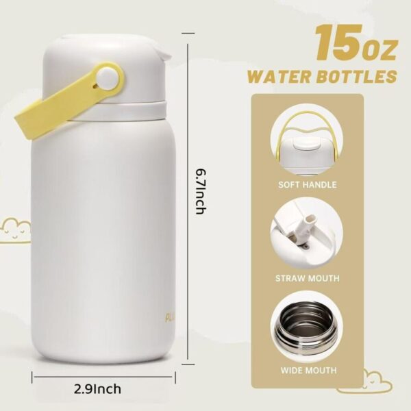 🏃🏻♀️💧【兒童友好型設計】-柔軟的硅膠噴嘴,對孩子的牙齒和牙齦溫和,隱藏的翻蓋吸管,讓孩子只需一隻手即可輕鬆打開和關閉,確保孩子在飲用時流暢而有節奏。打開翻蓋吸管後,孩子們立即享受輕鬆的單手飲用體驗。此外,15盎司的方便尺寸和無汗瓶身,更適合孩子的小手。