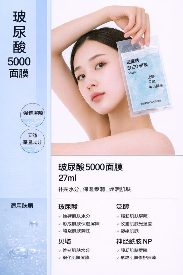 💧 𝟐.【玻尿酸5000超導保溼面膜】 ✅ 5000分子玻尿酸 + 12種維生素 ✅ 深層補水,修復屏障