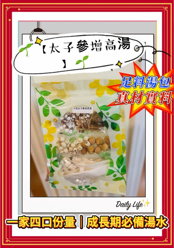 🅰️ 太子參增高湯🌱(每份2包) 👨👩👧👦 一家四口份量|溫和養生首選 🧒 成長期小朋友常見問題: ✔ 睡覺易出汗 ✔ 食極唔吸收 ✔ 身高慢人一步 👉 呢包真係專為「打好體質」而設 ✨功效亮點 🌱 健脾助吸收|補氣養身 🌱 打好底子・自然長得好 🌱 性質溫和不燥 🌱 老少咸宜,全家啱飲 🍲 煲法超簡單 1磅瘦肉 + 1.5L水,加入湯包,煲約1–1.5小時 👉 下鹽即可飲用 💛 湯甜清香,小朋友最易入口