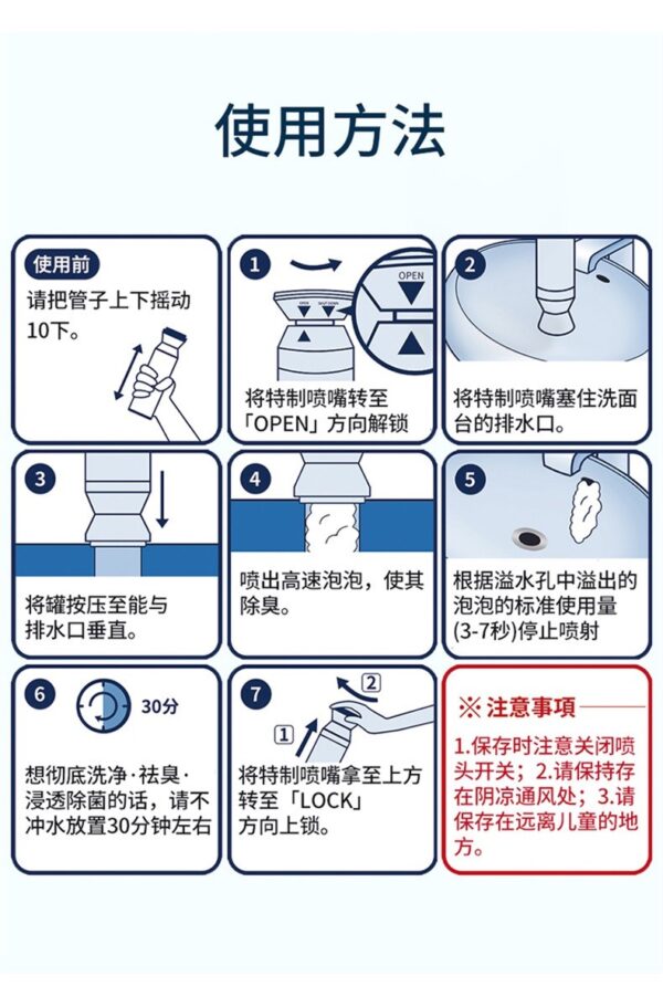 🔧【傻瓜式操作|3分鐘搞定】 1️⃣ 搖一搖:上下搖10下 2️⃣ 轉一轉:噴嘴轉到「OPEN」 3️⃣ 塞一塞:對準排水口密封 4️⃣ 噴一噴:噴3–7秒高速泡泡 5️⃣ 等一等:靜置30分鐘,沖水即可