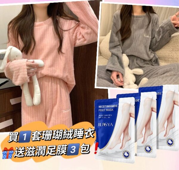 買1️⃣套珊瑚絨睡衣套裝🎁送滋潤嫩足護理足膜3️⃣包‼