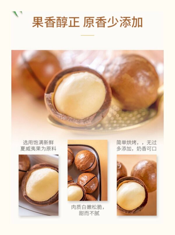 🌟夏威夷果仁富含油脂,嫩脆有嚼勁 肉質脆而細膩,自帶淡淡奶香~ 🌟個大飽滿圓潤,入口爽滑嘎嘣脆 味道香濃,果仁營養豐富,益智健腦 🌟果香醇正,原香少添加 肉質白嫩鬆脆,甜而不膩 簡單烘烤,無過多添加,奶香可口~