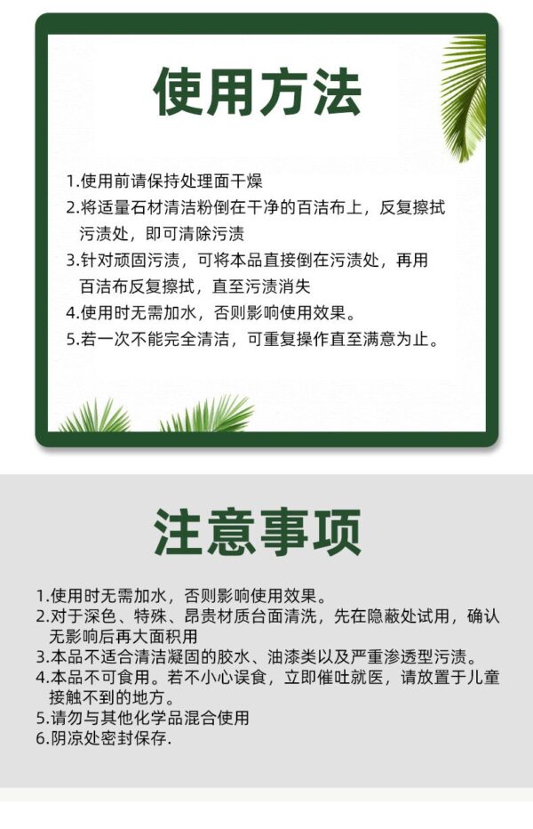 使用也很簡單👇 1️⃣清潔粉塗在污漬處 2️⃣靜置一會再用百潔布擦掉 很多滲進去的油漬、茶漬 都能被慢慢“吸”出來! 用完你會發現👇 原本發暗的石材 變乾淨、變亮、像新的一樣!