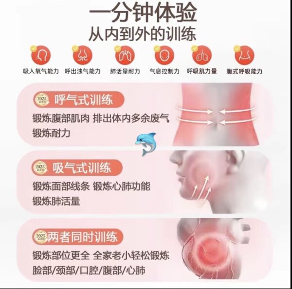 ✅腹式呼吸訓練:激活膈肌+腹橫肌,收緊腰腹,練出緊緻線條 ✅肺活量提升:呼吸抗阻訓練,強化心肺,爬樓不喘 ✅盆底肌修復:深層發力,改善鬆弛,產後友好 ✅體態改善:矯正呼吸模式,緩解含胸駝背,放鬆肩頸 ✅便攜隨時練:居家/辦公/出差/旅行,揣包就走