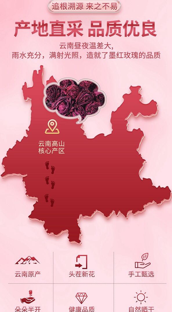 🌹嚴選雲南大理的重瓣紅玫瑰,雲南高原高海拔地區充足的陽光和優質的土壤,造就了墨紅玫瑰的好品質! 🌹人工採摘半開放的花朵,朵型完整,無昆蟲、無斑點、無腐爛 🌹零下40度凍幹鎖鮮,只去除水分,花朵裡95%的營養成分和藥用價值都被保留!