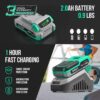 長效續航系統 🔋:2.0Ah 大容量鋰電 + 1小時快速充電器。電池實時電量監控,作業進度盡在掌握。