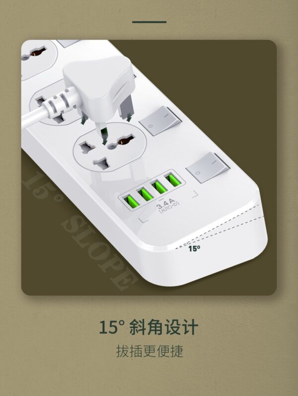 • 15°黃金斜角設計,拔插省力不刮手,插頭之間不打架,宿舍、居家、辦公室都適配!
