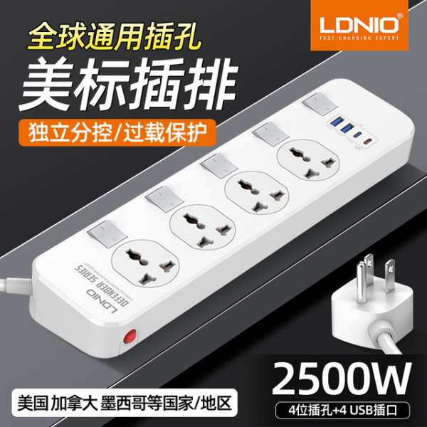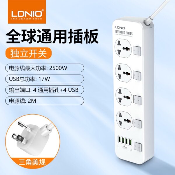🅰️ LDNIO排插 • 4個萬能插孔 + 4個USB快充口,兼容英標/美標/歐標/國標,香港、加拿大、國內電器都能用!手機、電腦、小家電同時供電,桌面零雜亂! • 獨立開關+AUTO-ID智能識別,每個插孔單獨控制,不用拔插頭,省電又安全;USB口自動匹配設備電流,不用額外帶充電頭! • CE認證+850℃阻燃外殼+兒童安全門,防燙防火防誤觸,2500W大功率,吹風機、電腦都能放心用! • 15°黃金斜角設計,拔插省力不刮手,插頭之間不打架,宿舍、居家、辦公室都適配!